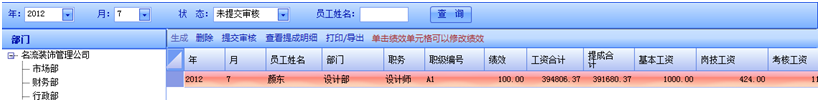 生成工資前要為員工選擇職級,否則無法為該員工生成工資,員工工資可按月批量生成。員工工資生成后將狀態(tài)選擇為未提交審核,便可查看該員工的工資情況,此時可以修改員工的績效,績效修改后,績效工資和工資合計會發(fā)生相應的變化。若確定無誤后就可以提交審核,提交審核也可以批量操作。