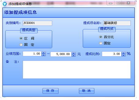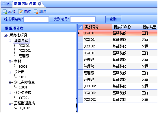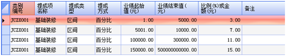 如圖,該圖是基礎(chǔ)裝修下的提成編號為JCZX001的提成信息。