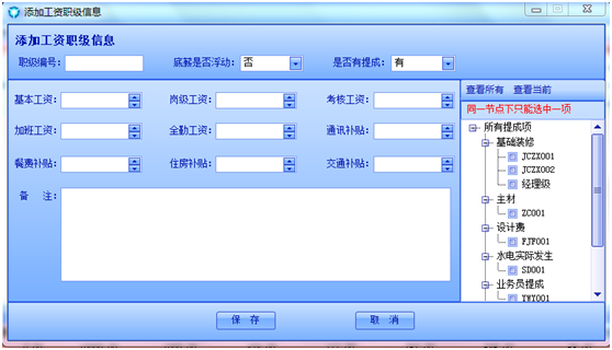 添加和修改工資職級時,建議先輸入職級編號,選擇底薪是否浮動,是否有提成,因為選擇不同的選項,界面會發(fā)生相應的變化。如圖是添加職級的界面。