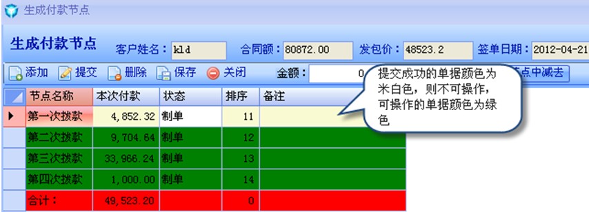 【添加】點擊添加按鈕,可添加撥款節(jié)點,如下圖所示:添加付款節(jié)點后點擊保存即可。