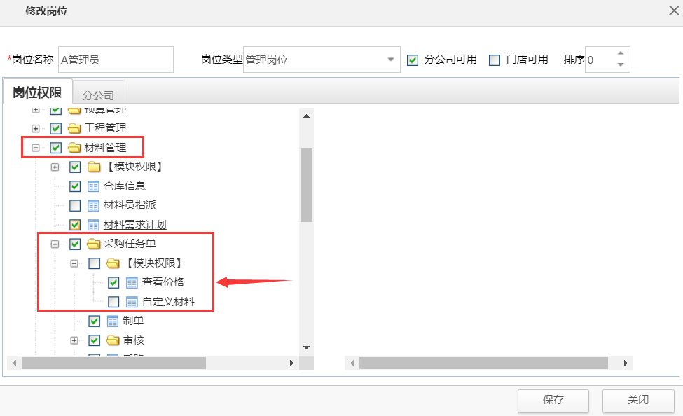第一步驟:通過崗位權限將采購任務單可自定義添加材料的功能開通