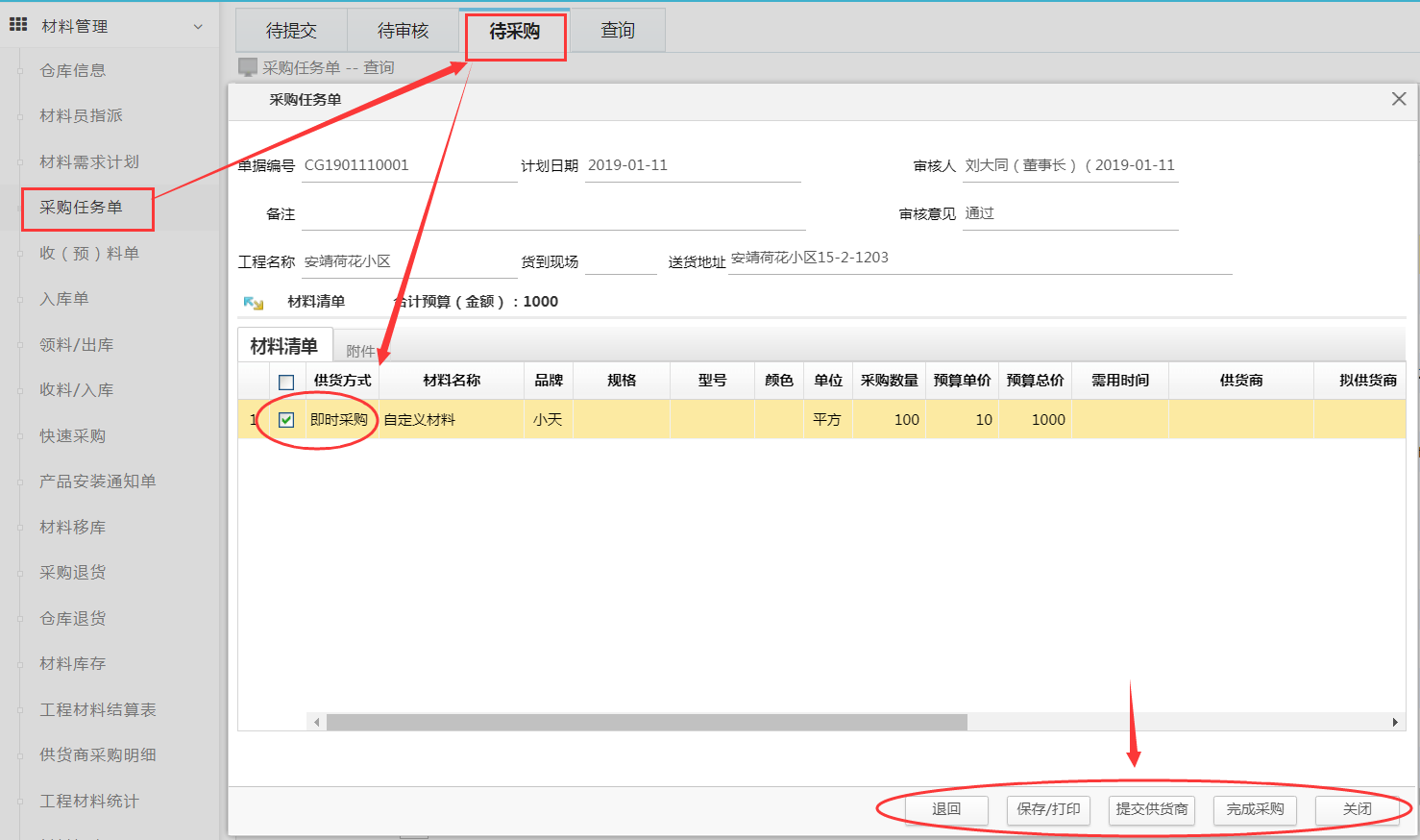 注意:采購任務單自定義添加的材料只能貨到現場,無法直接入倉庫,因為定額庫未維護進去庫存系統無法識別