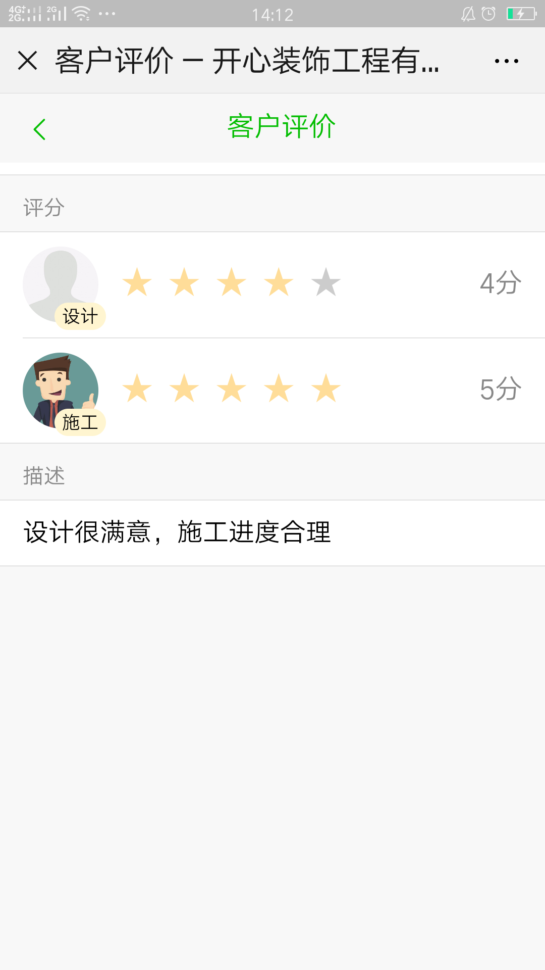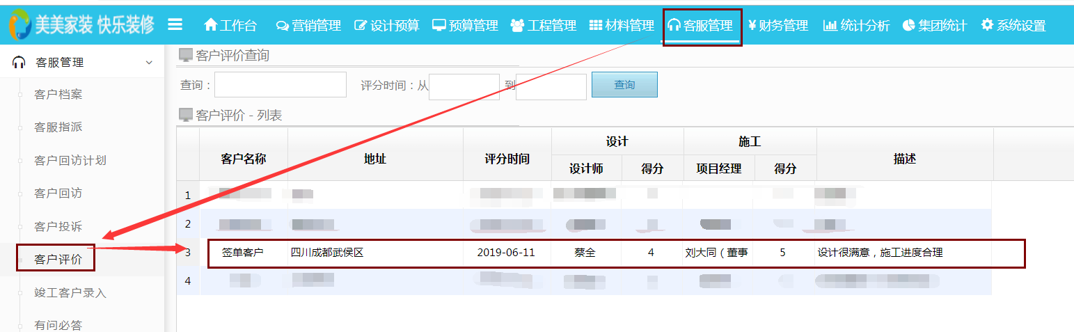 業主完成評分后,裝修公司可直接通過“客服管理”中的“客戶評價”快速查看業主提交的評分詳情,我們可以看到每個工程相對應的設計師、施工人員的相應評分,從而可以看出客戶的滿意度和工作人員的工作態度和能力。