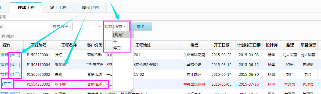 美佳云裝ERP針對工期問題新增了【工程開工/停工】設(shè)置,當(dāng)然啦,也可按開工或停工狀態(tài)來區(qū)分單獨查詢。要了解工地開工/停工情況,紅色就是停工的,黑色就是正在施工的,打開軟件一目了然。方便管理人員深入分析及時制定應(yīng)對方案。